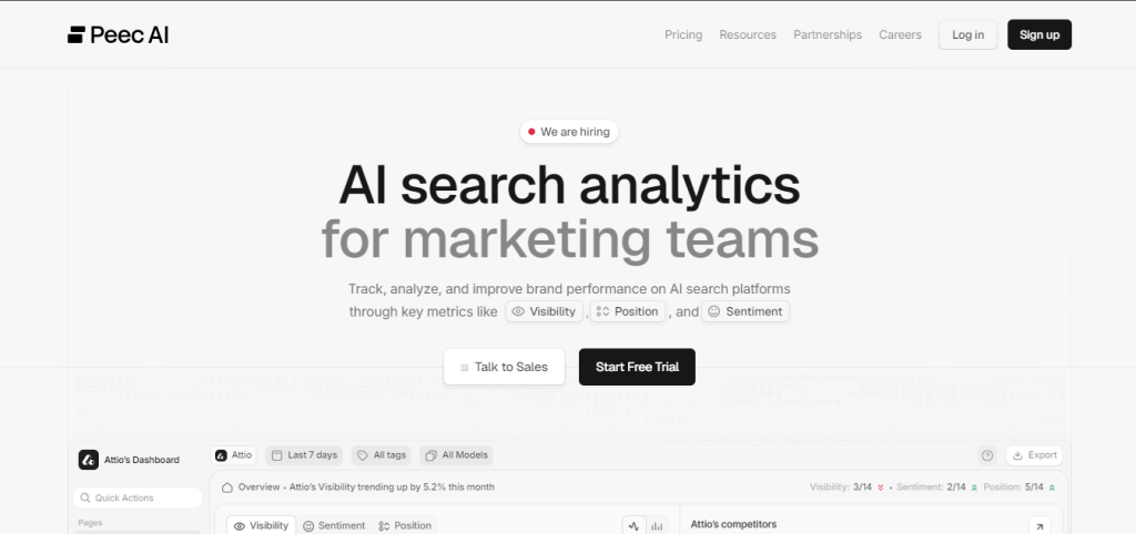 Peec AI is purpose‑built for AI search visibility, tracking how your domain is referenced across ChatGPT, Google AI Overviews, Perplexity, and others. Its dashboards focus on mention patterns, cite frequency, and ranking across LLM surfaces.