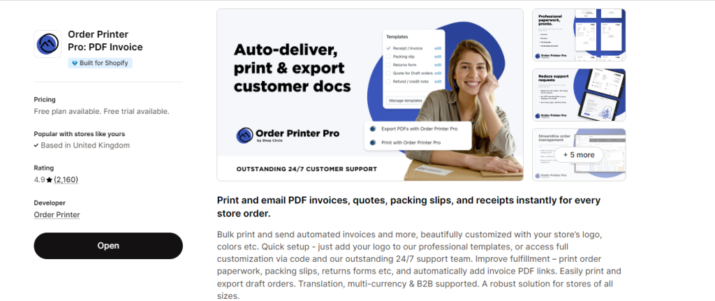 Order Printer Pro consistently ranks as the most popular invoice app on Shopify, with over 2,000 five-star reviews. It strikes the perfect balance between powerful features and user-friendly design.