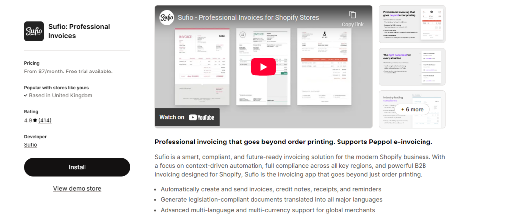 Sufio stands out as the premier dedicated invoicing app with the strongest focus on legal compliance and international tax requirements. Officially recommended by Shopify for B2B stores, it’s the go-to solution for wholesale operations.