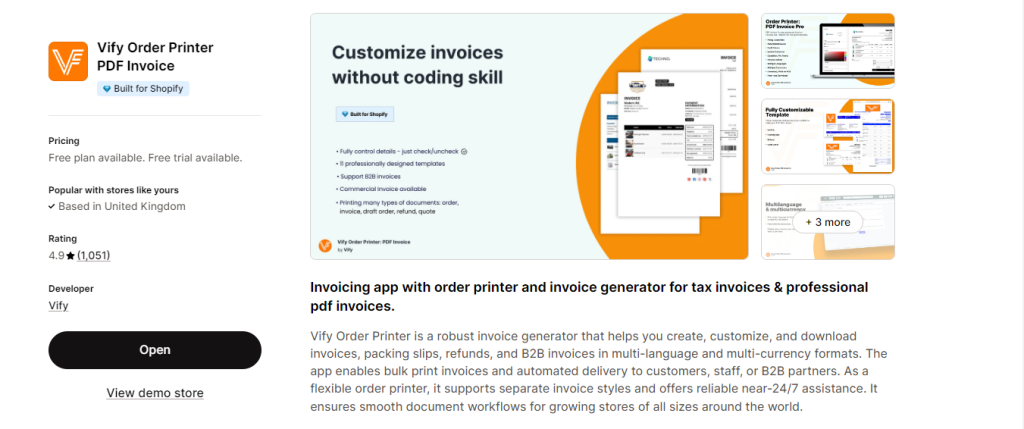 Vify Order Printer excels with its intuitive visual editor that requires zero coding knowledge, making professional invoice customization accessible to everyone.