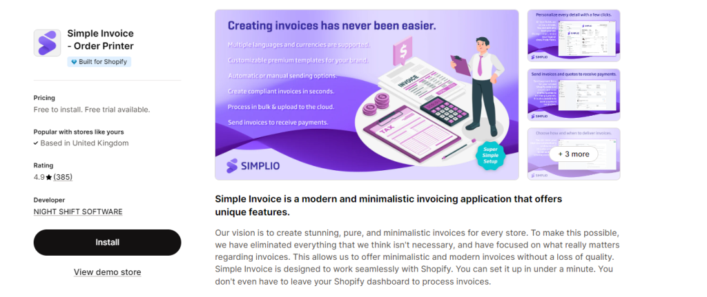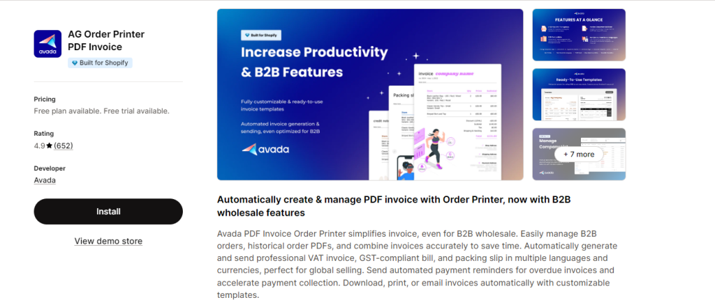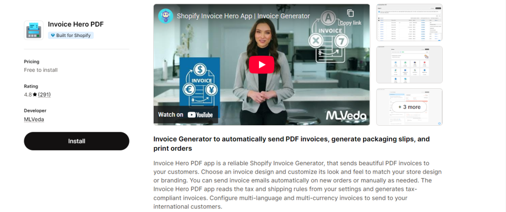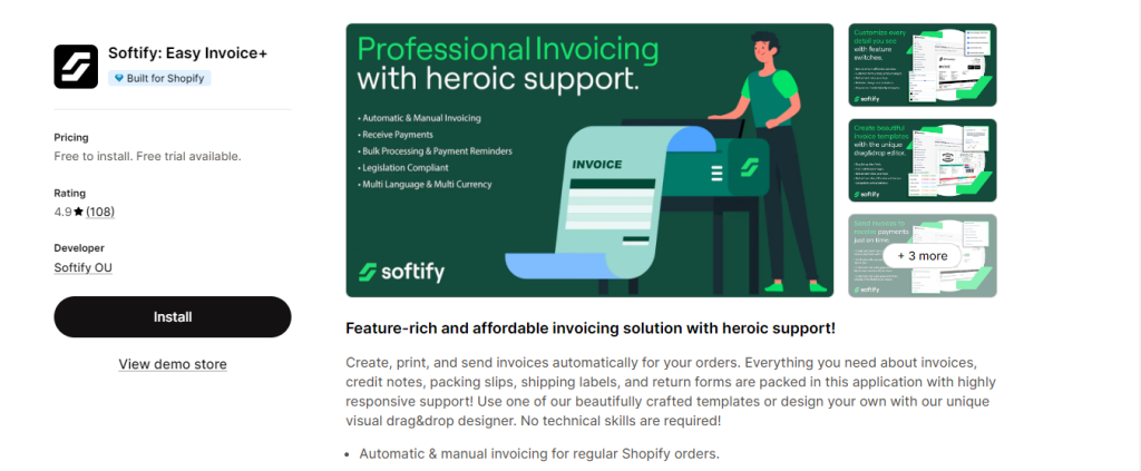 - Free Plan: 60 PDF prints & downloads/month, 10 invoice layouts, invoices/packing slips/refund notes, quick send email, translate invoices, Shopify POS support, email support