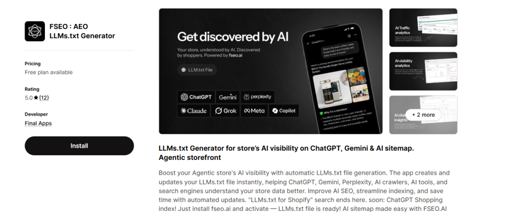 - AI-generated LLMs.txt files so AI crawlers like ChatGPT, Gemini, and other next-gen bots index your store better.