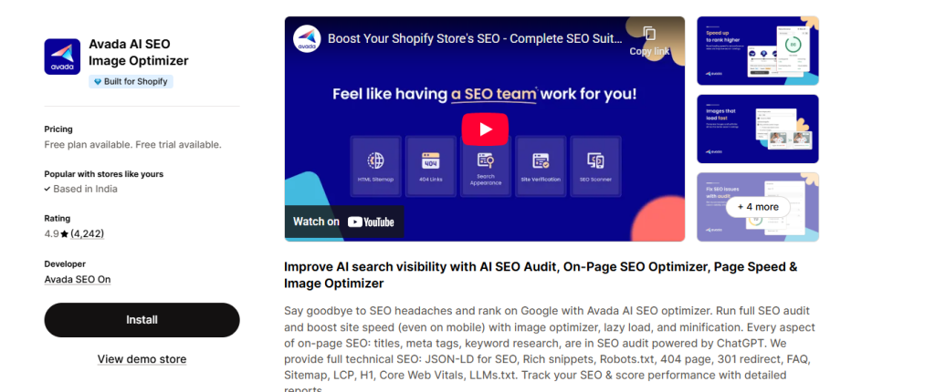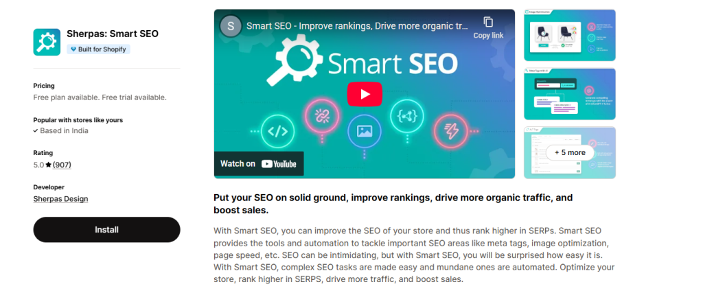 Why it ranks high: It offers powerful features even on the free plan. Perfect for new stores that want an all-in-one SEO solution.