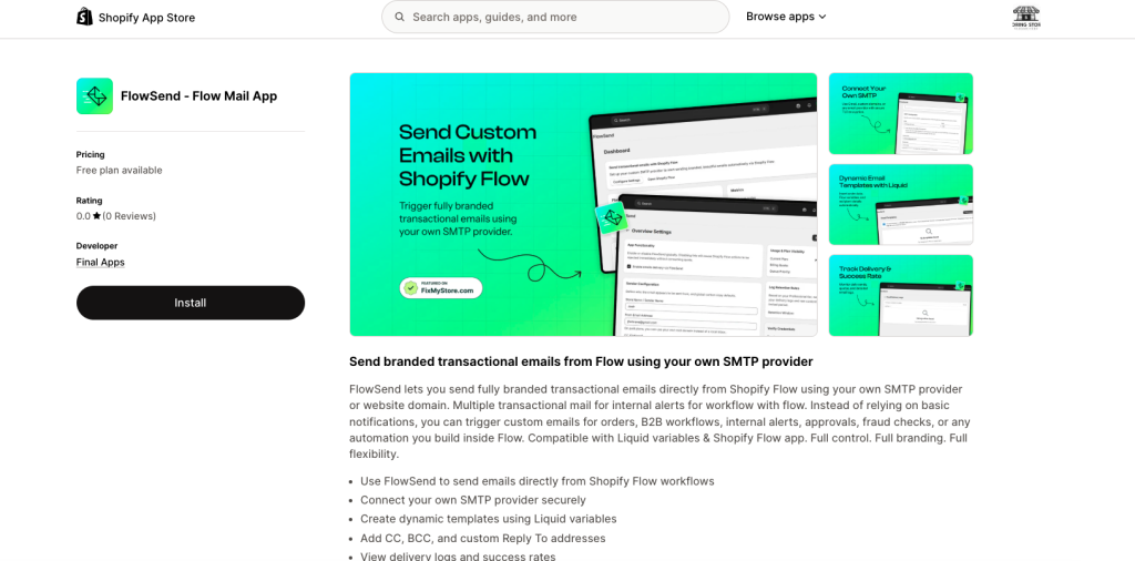 FlowSend is available on the Shopify App Store (by Final Apps), and you can start with a free plan to test your workflows.